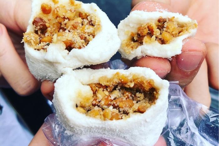 Hình ảnh của chùa Bà Mụ không chỉ gắn liền với kiến trúc cổ kính. Ngay bên ngoài cổng chùa còn có bán món bánh xoài, một đặc sản Hội An vô cùng hấp dẫn.
