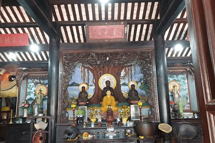 Hai bên chánh điện còn thờ Long Thần, Hộ pháp và phía sau thờ Tổ sư Đạt Ma tay cầm cuốn thư văn, dáng ngồi bán già. Những ngôi trường trong chùa đều có niên đại gần 260 năm và được làm hoàn toàn từ gỗ, sơn son thiếp vàng.
