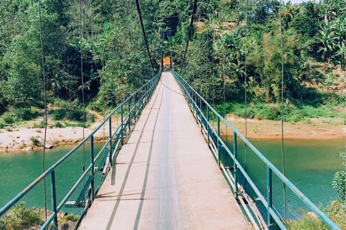 Trên đường chinh phục độ cao đỉnh Quế Tây Giang, bạn sẽ bắt gặp nhiều cây cầu treo bắc qua sông, qua suối. Bạn có thể dừng lại ở đây, tranh thủ chụp hình lưu niệm.