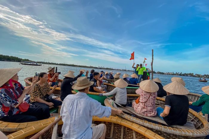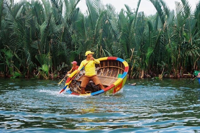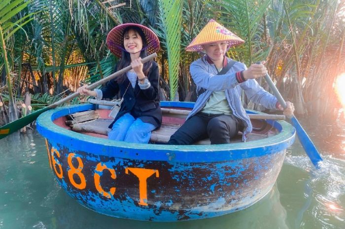 Bên cạnh việc tham quan, check in thì du khách nhất định đừng bỏ qua việc thuê thúng rừng dừa Bảy Mẫu để trải nghiệm.