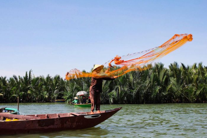 Ngoài múa thúng, du khách có thể chiêm ngưỡng màn quăng chài bắt cá đầy sinh động. Hãy tranh thủ giơ máy ảnh hoặc điện thoại để lưu lại được cảnh tượng mộc mạc ấn tượng này nhé.