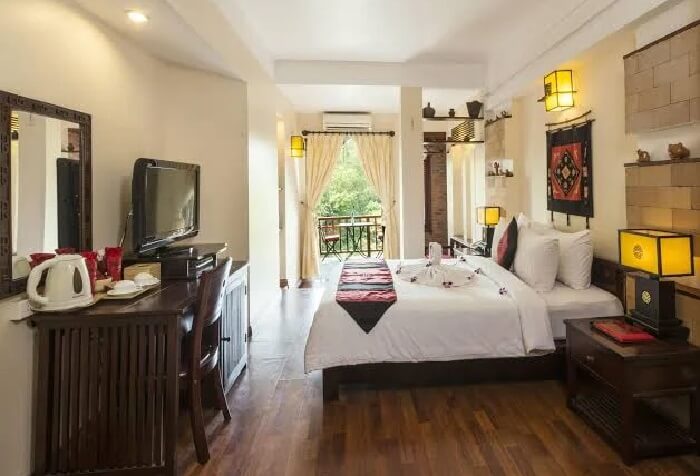 Lựa chọn Thien Thanh Boutique Hotel, bạn sẽ được nghỉ ngơi trong những căn phong sang trọng và tiện nghi. Từ ban công phía sau có thể ngắm cánh đồng xanh mát, còn ban công phía trước có thể quan sát được một góc của phố cổ và làng rau, khu chợ.