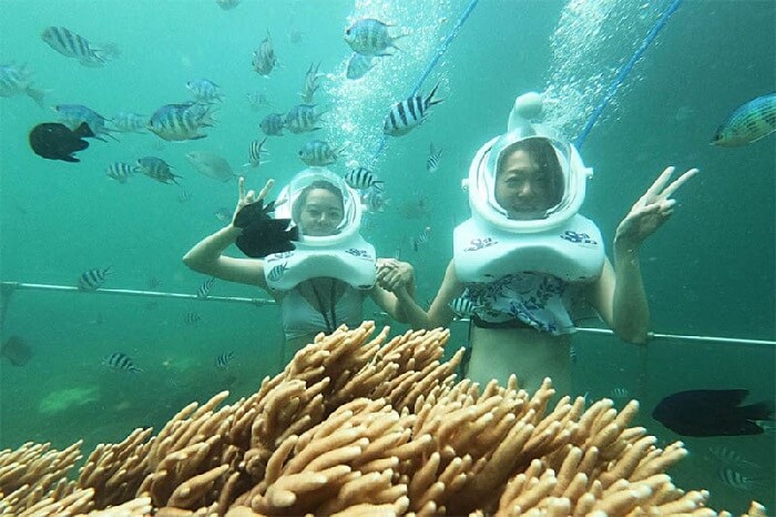 Đây là hình thức hiện đại nhất và tất nhiên giá vé cũng thuộc dạng cao nhất trong các hình thức lặn ngắm san hô. Khi tham gia, du khách sẽ được trang bị mũ lặn chuyên dụng 32kg (xuống nước giảm còn 7kg).
