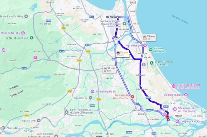 Từ trung tâm thành phố, du khách đi tuyến đường biển xuôi về thành phố Hội An. Đi theo quốc lộ hướng về Trần Thủ Độ – Điện Biên Phủ.