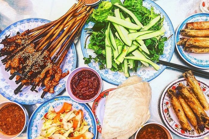 Nem nướng được ăn cùng bánh tráng, dưa leo, rau sống, chuối chát… chấm cùng nước sốt đậu phộng sền sệt. Địa chỉ ăn món ngon trong phố cổ Hội An là: