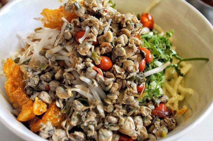 Review món ăn ngon ở Hội An còn có món cơm hến thơm ngon. Hến được sử dụng là hến tươi xào cùng nước hến ngọt thanh, thêm mắm, thêm tóp mỡ, rước, vụn mì chiên giòn, đậu phộng, ớt màu và đem trộn đều với cơm nóng.
