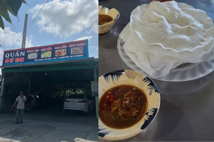 Bánh đập của quán kết hợp giữa bánh ướt mềm dẻo và bánh tráng giòn tan ăn kèm với nước chấm mắm nêm được pha thơm ngon, đặc quánh. Đặc biệt, không gian sân vườn xanh mát mang đến cho thực khách sự thư thái, thoải mái khi ăn uống.