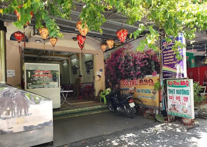 Ở đây chuyên thịt nướng cuốn rau sống, thịt nướng cuốn bánh ướt và bún thịt nướng. Món nào cũng ngon nhưng nếu bạn tìm quán bún Hội An thì nhất định phải thử bún thịt nướng cô Thu.