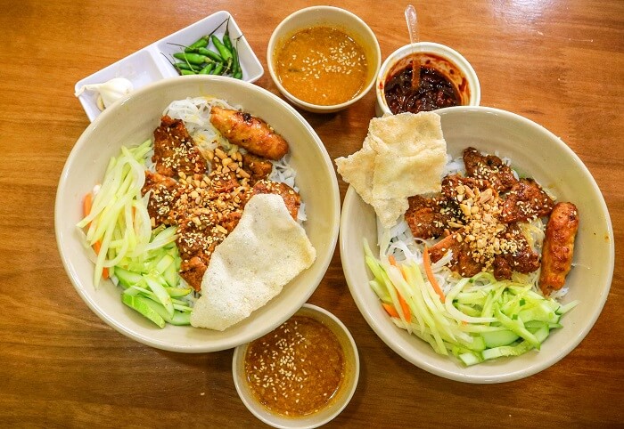 - Bún mắm nêm: Hấp dẫn với nước mắm nêm đậm đà cùng topping từ thịt luộc, tai heo, nem chả, đậu phộng và ăn kèm rau sống.