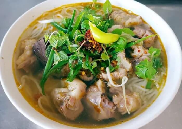 Bún bò ở đây có hương vị đặc trưng miền Trung với nước dùng đậm đà, cay nhẹ. Dù không có mắm ruốc như bún Huế nhưng vẫn rất thơm. Quán phục vụ bún với thịt heo hoặc thịt bò, kèm chả, huyết và cả bánh mì giòn rụm.