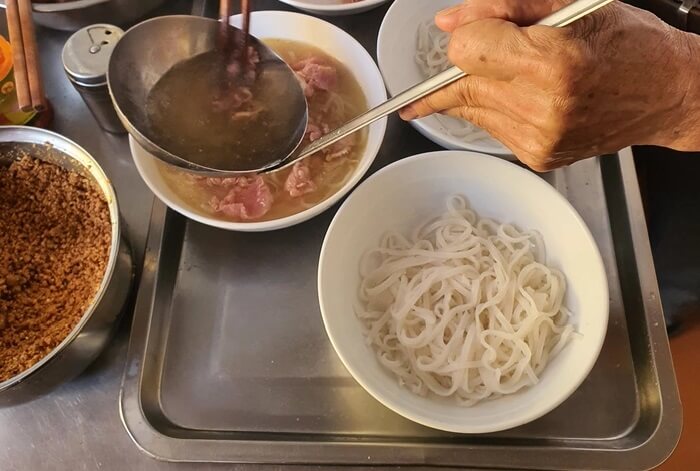 Thịt thái mỏng, khi chan nước dùng vào, thịt tái tới, giúp giữ được độ tươi ngon. Dù quán nổi tiếng lâu đời nhưng giá cả ở đây vẫn rất bình dân, phù hợp với mọi người.