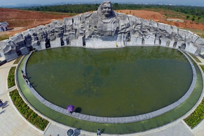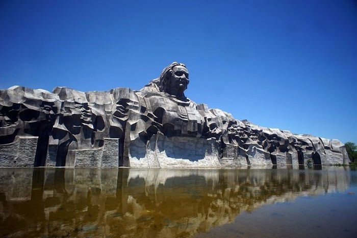 Bao quanh tượng đài là một hồ nước rất rộng lớn. Diện tích hồ lên tới hơn 1000m2, nhìn từ ngoài những dòng nước chảy từ vách tượng đài tạo cảm giác tràn viền rất đẹp.
