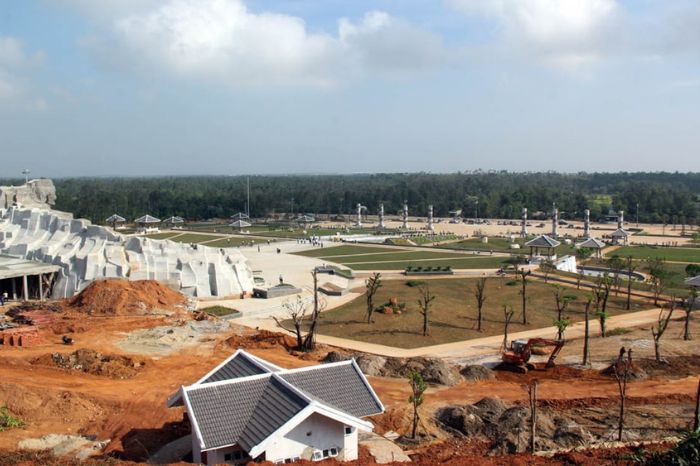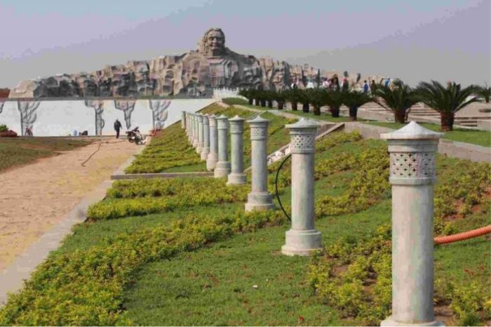 Bên cạnh tượng là những khối đá được làm từ đá hoa cương chạy dài theo hình cánh cung, rộng 120m. Toàn bộ công trình vĩ đại này được xây dựng từ hơn 20.000 tấn đá được vận chuyển về từ Bình Định.