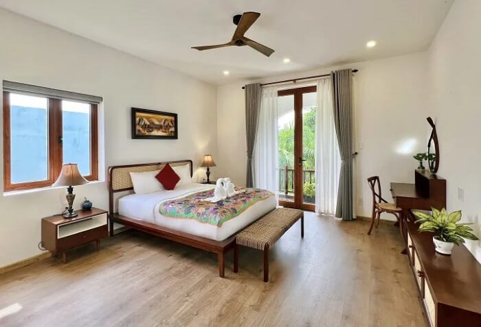 Các phòng nghỉ villa Hội An sang trọng, rộng rãi và đầy đủ nội thất, tiện nghi không thua gì phòng khách sạn. Mỗi phòng đều có nhà tắm riêng, nhiều số còn có ban công ngắm cảnh, hòa mình vào thiên nhiên, đón ánh nắng mặt trời.